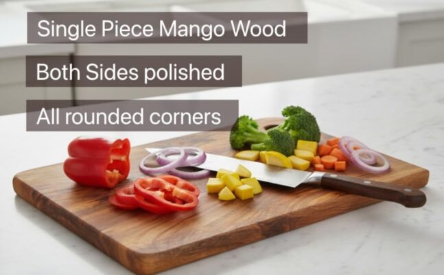 ✓ Premium Construction: Crafted from single-piece Mango Wood, this chopping board offers exceptional durability and longevity. The single-piece construction ensures no joints or weak points, making it incredibly sturdy and reliable for years of heavy-duty kitchen use.